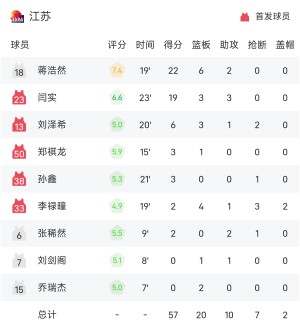 蒋浩然半场7中5轰19分4板,江苏全队一共34分