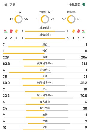 吉达国民首发阵容:16-门迪、3-伊巴涅斯、27-马杰拉希、32-达姆斯、5-苏莱曼、7-马赫雷斯、79-凯西、10-米约、20-冈萨尔维斯、6-埃多阿、9-布赖坎